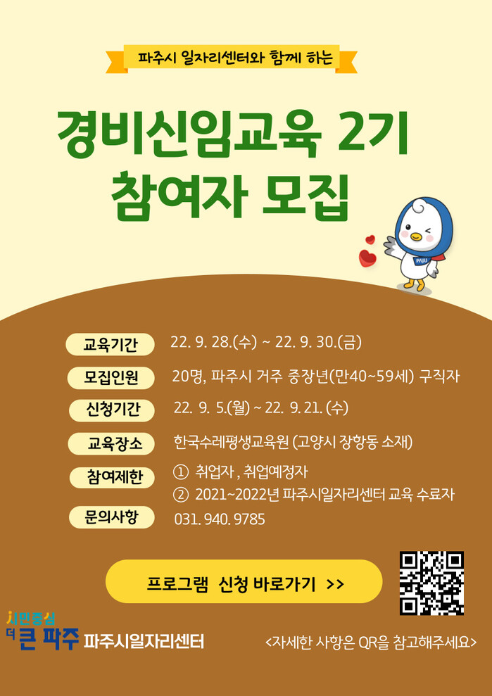 참여 자격은 만 40세~59세의 파주시 구직자로, 포스터 내 QR코드로 신청하거나 파주시일자리센터(문산, 운정, 금촌)로 방문하거나 이메일로 신청하면 된다.