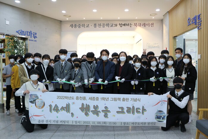 그림책은 여주도서관을 비롯한 7개 시립도서관에 나누어 전시 중이며 지난 8일에는 여주도서관에서 여주시 평생교육과 장지순 과장과 흥천중 박명래 교감, 세종중과 흥천중 교사와 학생 45명이 참석해 전시회 개막 테잎을 컷팅하고 그램책, 원화, 원화로 만든 배지 등을 관람했다.