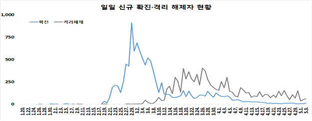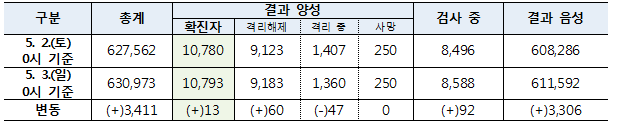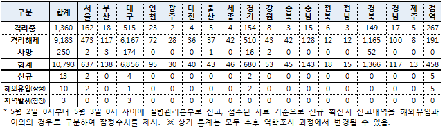 질병관리본부 중앙방역대책본부(본부장 정은경)는 3일 0시 현재, 총 누적 확진자수는 1만793명(해외유입 1091명·내국인 90.5%)이며, 이중 9183명(85.1%)이 격리해제 됐다고 밝혔다.