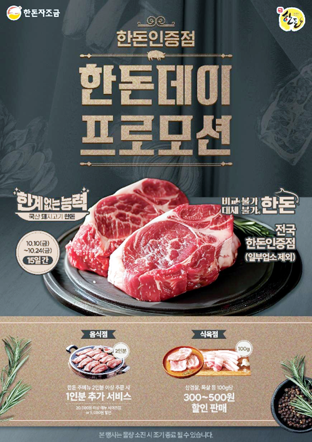한돈데이를 맞아 10월 10일부터 24일까지 15일간 전국 한돈인증 음식점과 식육점에서 한돈 할인 행사가 진행된다.