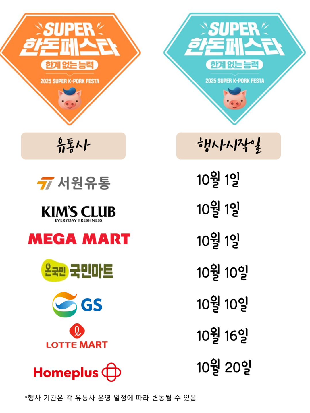 더불어, 홈플러스, 롯데마트, 서원유통, 메가마트, 지에스, 국민마트, 킴스클럽 등 총 7곳의 전국 유통사도 할인 행사에 참여한다. 각 유통사별로 삼겹살, 목살, 앞다리살을 정상가 기준 10~20% 할인해 판매한다.