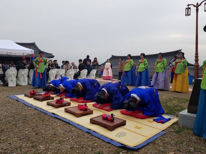 ▲지난 24일 열린 다문화가정 전통혼례식에서 신랑들이 절을 하고 있다.(사진=권인진 기자) |