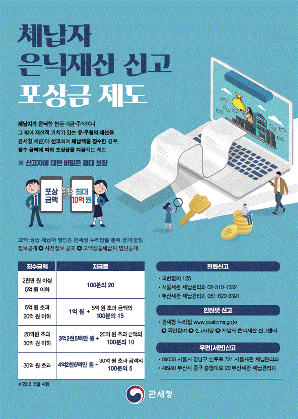 관세청은 체납자 은닉재산 신고 활성화를 위해 포상금 지급률을 높여 체납자 은닉재산을 신고한 사람에게 포상금이 상향 지급(최대 10억원) 되도록 관세법 시행령을 개정(’22.2.18. 시행)해 운영 중이다.