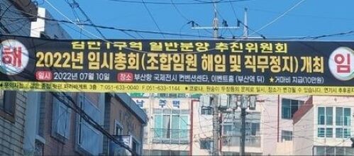 ▲부산 감만1구역 비대위가 지난달 내건 '2022년 임시총회(조합임원 해임 및 직무정지) 개최'를 알리는 현수막. 비대위는 이 임총 나흘 전인 지난 6일 갑자기 '임총을 연기한다'고 공고한 뒤 지금까지 추가 일정을 밝히지 않고 있다. |