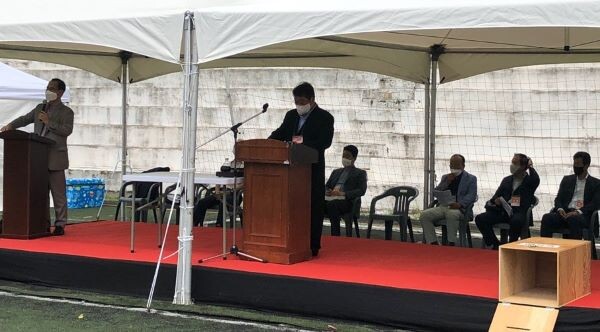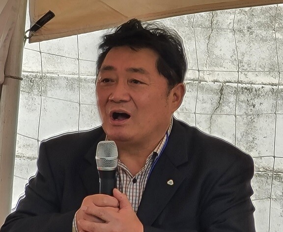 ▲지난 23일 오후 2시 옛 부산외대 대운동장에서 감만1구역재개발정비사업조합(감만1구역조합)이 개최한 ‘2022년도 임시총회’가 진행 중인 가운데, 김경래 조합장이 인사말을 하고 있다. 이날 임총은 전체조합원 중 56.4%인 1366명이 참석해 과반수를 충족했다. |