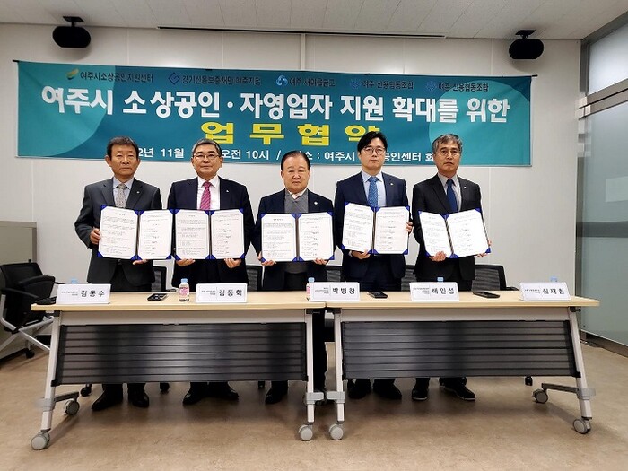 [로컬세계=김병민 기자]지난 15일 여주시소상공인지원센터는 센터를 주체로 경기신용보증재단 여주지점과 여주새마을금고, 여주신용협동조합, 여흥신용협동조합이 여주시 소상공인의 경영안정과 지역경제 활성화를 위한 업무협약을 체결했다고 16일 밝혔다.