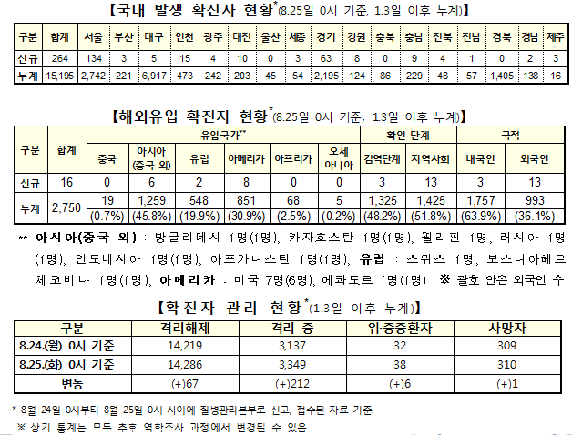 질병관리본부 중앙방역대책본부(본부장 정은경)는 25일 0시 현재, 국내발생 신규확진자는 264명이 확인됐고, 해외유입은 16명이 확인돼 총 누적 확진자수는 1만7945명(해외유입 2750명)이라고 밝혔다.