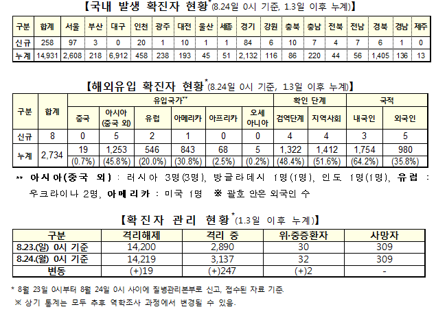 질병관리본부 중앙방역대책본부(본부장 정은경)는 24일 0시 현재, 국내발생 신규확진자는 258명이 확인됐고, 해외유입은 8명이 확인돼 총 누적 확진자수는 1만7665명(해외유입 2734명)이라고 밝혔다.