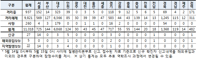 ◆지역별 확진자 현황 (5.15일 0시 기준, 1.3일 이후 누계)