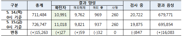 질병관리본부 중앙방역대책본부(본부장 정은경)는 15일 0시 현재, 신규확진자가 27명 발생해 총 누적 확진자수는 1만1018명(해외유입 1150명·내국인 89.8%)이라고 밝혔다.
