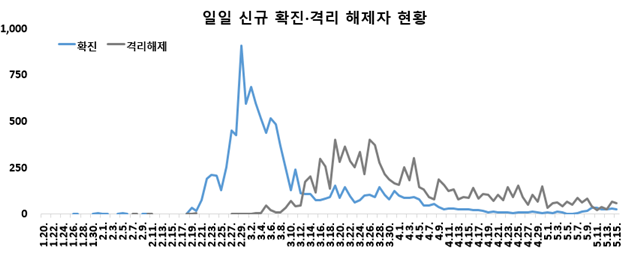 ▲확진자 일별 추세 (5.15. 0시 기준, 11,018명) |