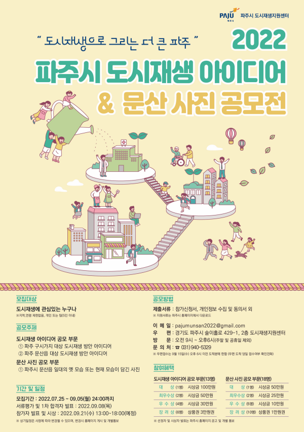 [로컬세계 = 이영원 기자]경기 파주시(시장 김경일)는 도시재생에 대한 파주시민의 관심을 높이고, 시민들의 창의적인 도시재생 아이디어를 발굴하기 위해 ‘2022 파주 도시재생 아이디어·사진 공모전’을 개최, 오는 9월 5일까지 아이디어와 사진을 접수한다고 27일 밝혔다.