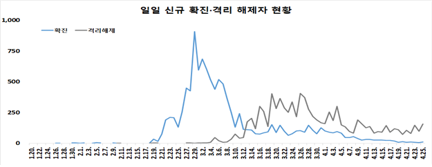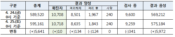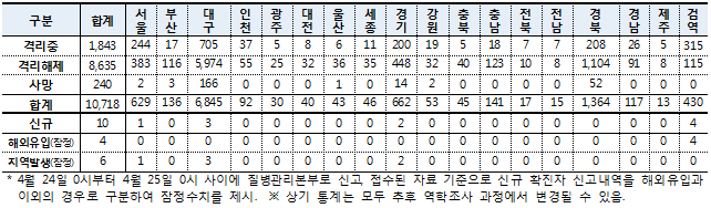 질병관리본부 중앙방역대책본부(본부장 정은경)는 25일 0시 현재, 총 누적 확진자수는 1만718명(해외유입 1,027명·내국인 91.4%)이며, 이중 8,635명(80.6%)이 격리해제 됐다고 밝혔다.