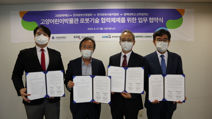 고양문화재단은 지난 27일 고양아람누리에서 정재왈 고양문화재단 대표이사와 한국로봇산업협회 조영훈 전무, 한국로봇사용자협회 이천 센터장, 평택대학교 산학협력단 이태규 단장 등 4개 기관 관계자가 모인 가운데 업무 협약을 진행했다.