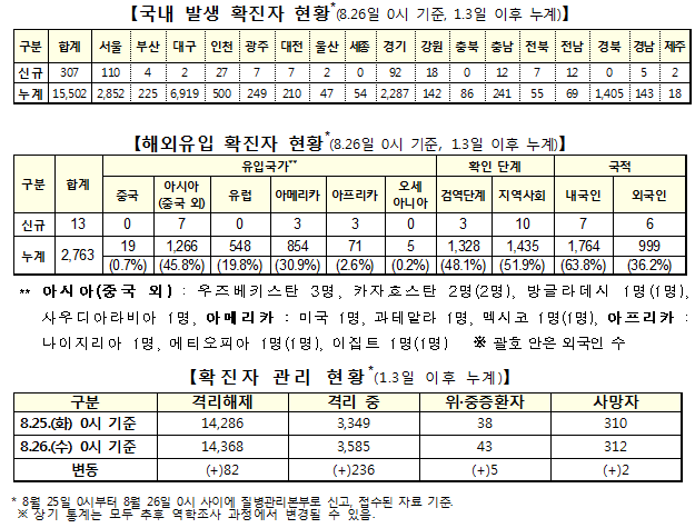 질병관리본부 중앙방역대책본부(본부장 정은경)는 26일 0시 현재, 국내발생 신규확진자는 307명이 확인됐고, 해외유입은 13명이 확인돼 총 누적 확진자수는 1만8265명(해외유입 2763명)이라고 밝혔다.
