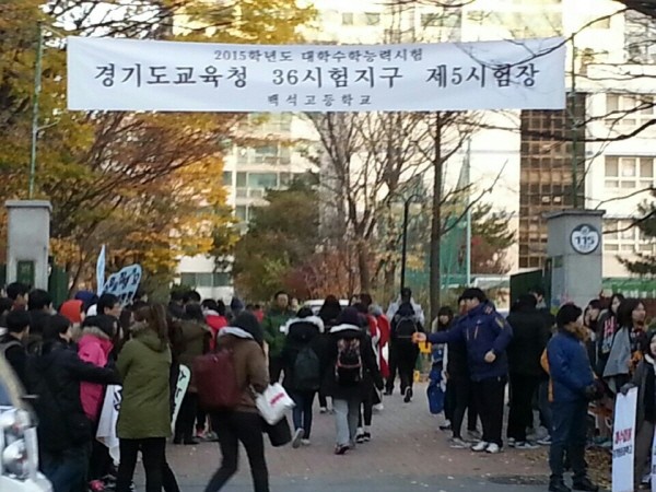 ▲경기 일산의 한 수능시험장 앞에서 응시자들이 학부모와 후배들의 격려를 받으며 교문을 지나고 있다. 사진제공 KNS뉴스통신. |