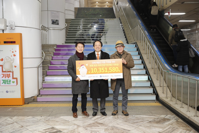 ▲365mc와 서울문화재단이 사회 인프라 부재로 인한 어려운 여건 속에서 작업 활동을 이어가는 장애예술인의 창작활동을 지원한다.사진은 강남구청역에 설치 운영 중인 아트건강기부계단 앞에서 기부금 전달식 장면 [365mc 제공] |