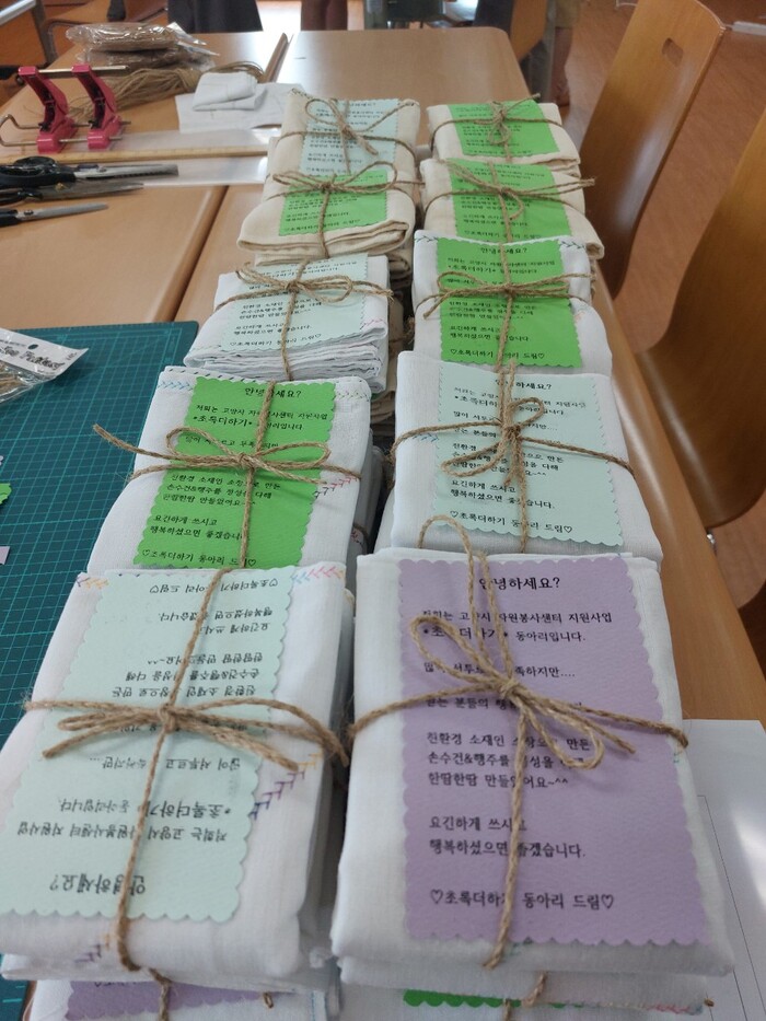 시민참여 봉사활동 지원사업에 참여 중인 ‘초록더하기’ 봉사단은 홀몸 어르신께 드릴 200개의 소창행주와 손수건을 직접 재단, 제작하여 마두1동행정복지센터에 전달했다.