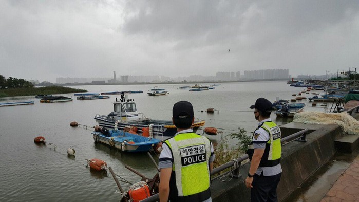 | ▲태풍 북상을 앞두고 해양경찰관들이 관활항포구 '녹산항'을 순찰하고 있다 |