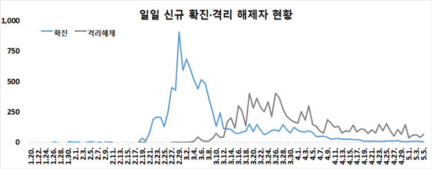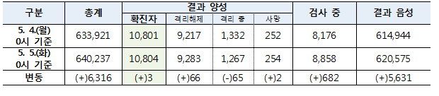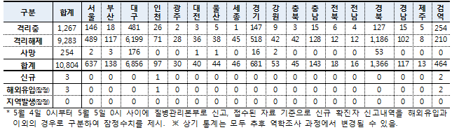 질병관리본부 중앙방역대책본부(본부장 정은경)는 5일 0시 현재, 총 누적 확진자수는 1만804명(해외유입 1102명·내국인 90.5%)이며, 이중 9283명(85.9%)이 격리해제 됐다고 밝혔다.
