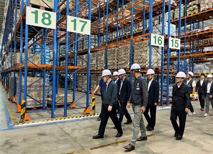 ▲ 우성태 농협경제지주 농업경제대표이사(맨 앞)가 지난 8일 경기도 평택시 마트사업중부지사 내부를 순람하며 현장 안전보건관리체계를 점검하고 있다. 농협 제공 |
