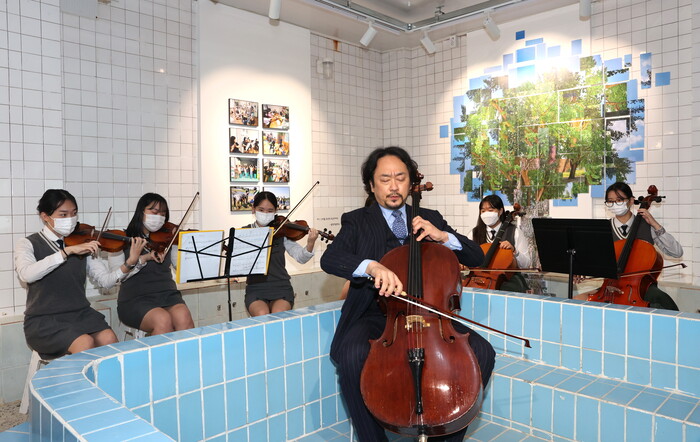 ▲ 지난 21일 사진전 오픈식에는 김규식 첼리스트와 안계중학교 오케스트라가 협연하는 공연이 펼치고 있다. |