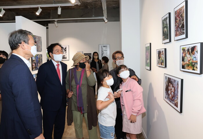 ▲김주수 군수(왼쪽에서 두번째)가 다함성 의성마을학교 사진전을 둘러보고 있다. (의성군 제공) |