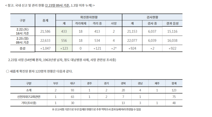 질병관리본부 중앙방역대책본부(본부장 정은경)는 23일 청도 대남병원 54번 환자(1963년생 남, 청도 대남병원 사례, 사망 관련성 조사중)가 사망했으며 이날 09시 현재, 전일 16시 대비 확진환자 123명이 추가로 확인됐다고 밝혔다.
