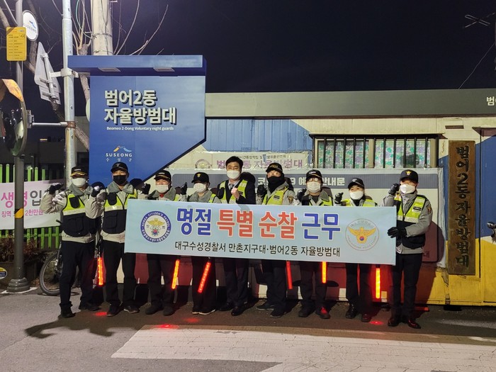 범어2동 자율방범대는 지난 3일 설 명절을 앞두고 주민들의 안전을 위해 설맞이 특별 방범순찰활동을 실시했다. 평소 범어2동 자율방범대는 관내의 상황을 잘 고려해 구성한 순찰 코스를 바탕으로 관내 범죄 취약지역을 점검하고 주기적인 순찰을 하고 있다.