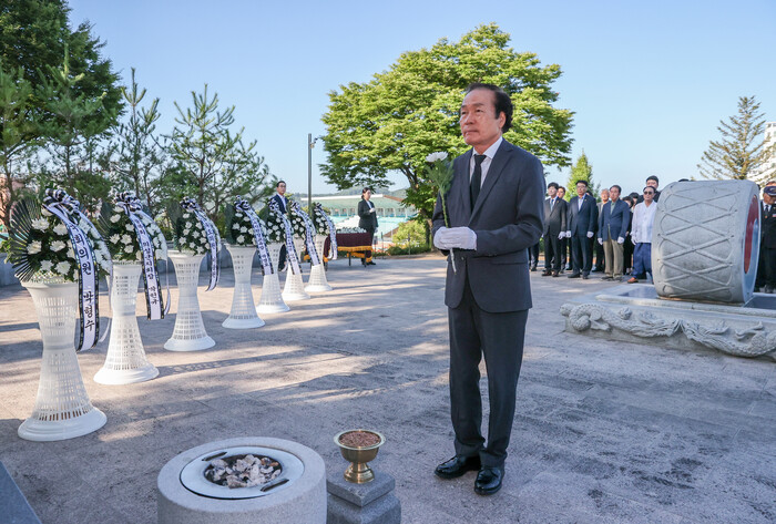 ▲ 김주수 군수가 15일 항일독립운동기념탑에서 헌화를 하고 있다. 의성군 제공 |