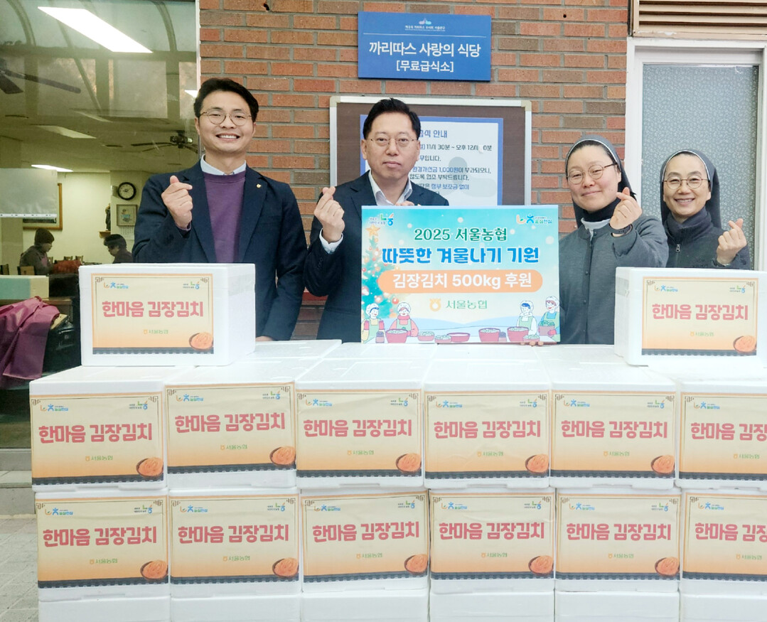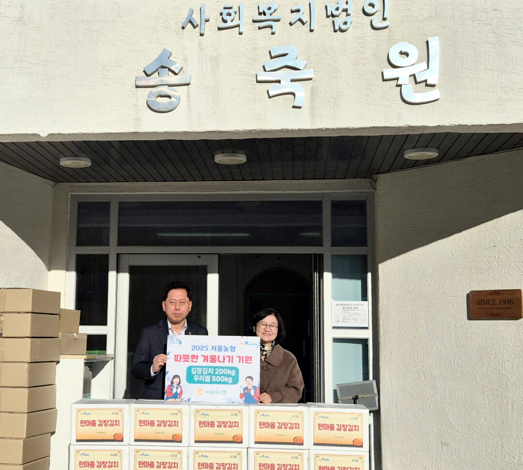 서울농협(본부장 맹석인)은 지난 8일 연말연시를 맞아 지역사회 어려운 이웃을 돕고 우리 농산물 소비를 촉진하기 위한「따뜻한 겨울나기 기원 우리 농산물 나눔행사」를 실시했다. 이날 맹석인 본부장은 관내 까리따스 수녀회와 아동복지시설 송죽원을 방문하여 김장김치 700kg·우리 쌀 500kg을 후원하며 소외 계층의 따뜻한 겨울나기를 응원했다. 농협 제공
