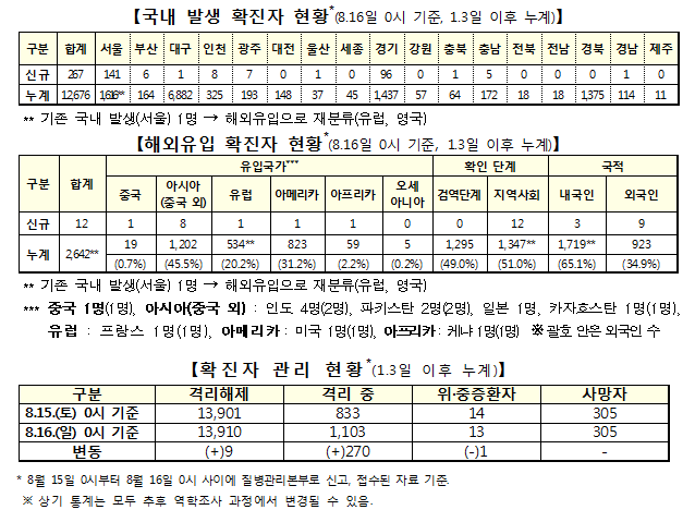 질병관리본부 중앙방역대책본부(본부장 정은경)는 15일 0시 현재, 국내발생 신규확진자는 267명이 확인됐고, 해외유입은 12명이 확인돼 총 누적 확진자수는 1만5318명(해외유입 2642명)이라고 밝혔다.
