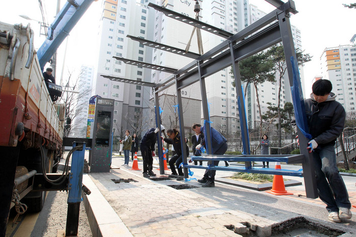 ▲광주 북구청 교통지도과 교통시설팀 직원들이 3월 14일 운암동 벽산블루망 앞 시내버스 유개승강장에서 장비를 동원해 승강장 교체 작업을 하고 있다. 북구는 1분기 지방재정 조기집행률 55.38%로 구별 최고를 기록했다. |