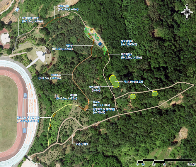 이번 테마숲은 누구나 다 부담 없이 걸을 수 있는 숲길을 조성하고자 급경사지 내 데크로드 설치 및 도심 속 힐링 제공을 위한 빛모아쉼터 등 조성할 계획이다.