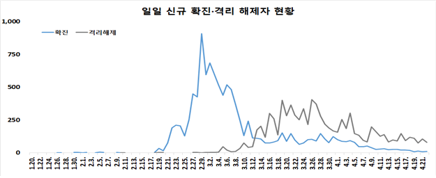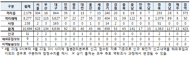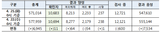 질병관리본부 중앙방역대책본부(본부장 정은경)는 22일 0시 현재, 총 누적 확진자수는 1만694명(해외유입 1017명·내국인 91.6%)이며, 이중 8277명(77.4%)이 격리해제 됐다고 밝혔다.