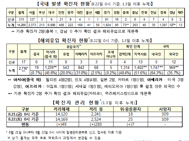 질병관리본부 중앙방역대책본부(본부장 정은경)는 22일 0시 현재, 국내발생 신규확진자는 315명이 확인됐고, 해외유입은 17명이 확인돼 총 누적 확진자수는 1만7002명(해외유입 2716명)이라고 밝혔다.
