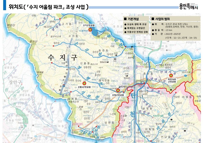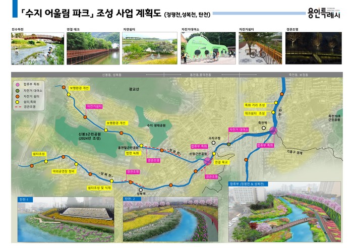 김광호 수지구청장은 "용인시가 시의 랜드마크인 용인 어울림파크 조성사업을 하는 만큼 수지구도 사업에 동참해 주요 하천과 공원을 연결하는 녹지축을 만들 계획"이라며 "용인시민들이 언제 어디서나 편안히 쉬다 갈 수 있는 도심 속 녹색공간을 지속적으로 확보해 나가겠다"고 말했다.