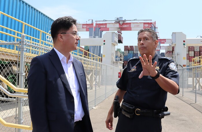 앞서 윤 청장은 이날 오전(현지시간), 미국 관세국경보호청(CBP, Customs and Border Protection)의 안내로 미국 컨테이너 물동량의 약 35%를 처리하는 최대 거점항인 LA항 및 롱비치항 현장을 방문한 뒤, 현지 진출 우리 기업 관계자들과 간담회를 가졌다.