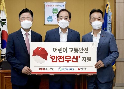 [로컬세계 부산 = 전상후 기자] BNK부산은행은 18일 오후 부산시교육청에서 안감찬 부산은행장, 하윤수 부산시교육감, 최금식 부산사회복지공동모금회장 등이 참석한 가운데 어린이 교통안전을 위한 ‘안전우산’ 전달식을 가졌다고 19일 밝혔다.