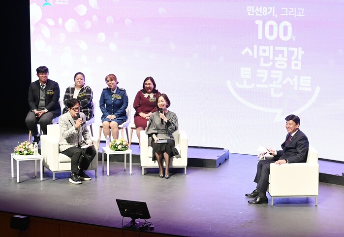 시장과 함께하는 토크 마당에서는 ‘함께하는 희망 도시, 함께 만드는 행복 광주’를 주제로 시정 철학 및 취임 100일간의 소회 등을 밝히고 시정에 관해 시민들과 편안하고 자유롭게 대화하는 시간으로 꾸며졌다.
