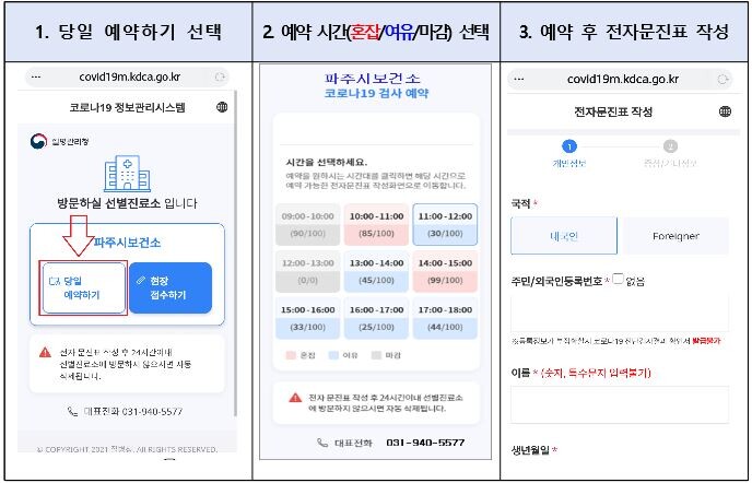 예약 방법은 보건소에서 제공하는 문자나 앱을 통해 코로나19 정보관리시스템에 접속해 원하는 시간대를 선택하고 전자문진표를 작성하면 되며, 예약이 완료되면 문자메시지가 발송된다.
