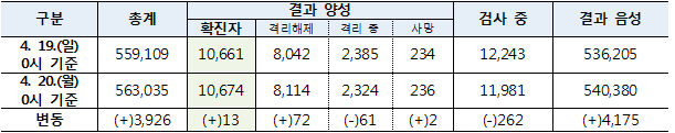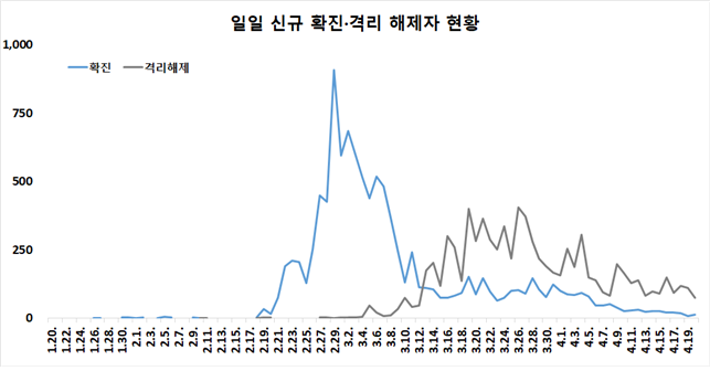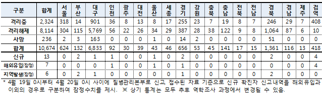 질병관리본부 중앙방역대책본부(본부장 정은경)는 20일 0시 현재, 총 누적 확진자수는 1만674명(해외유입 1,006명·내국인 91.7%)이며, 이중 8,114명(76.%)이 격리해제 됐다고 밝혔다.