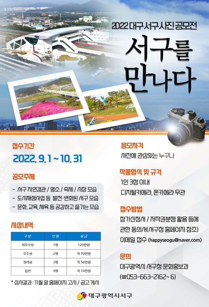 류한국 서구청장은 “서대구역 고속철도 개통과 주택재건축ㆍ재개발사업 등으로 변화, 발전하고 있는 서구의 현재 모습을 수집하고 기록하는 한편, 서구의 다양한 매력과 변모하는 모습을 알리는 계기가 되길 기대한다”고 전했다.