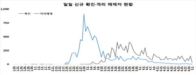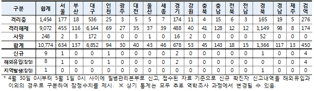 질병관리본부 중앙방역대책본부(본부장 정은경)는 1일 0시 현재, 총 누적 확진자수는 1만774명(해외유입 1073명·내국인 90.6%)이며, 이중 9072명(84.2%)이 격리해제 됐다고 밝혔다.