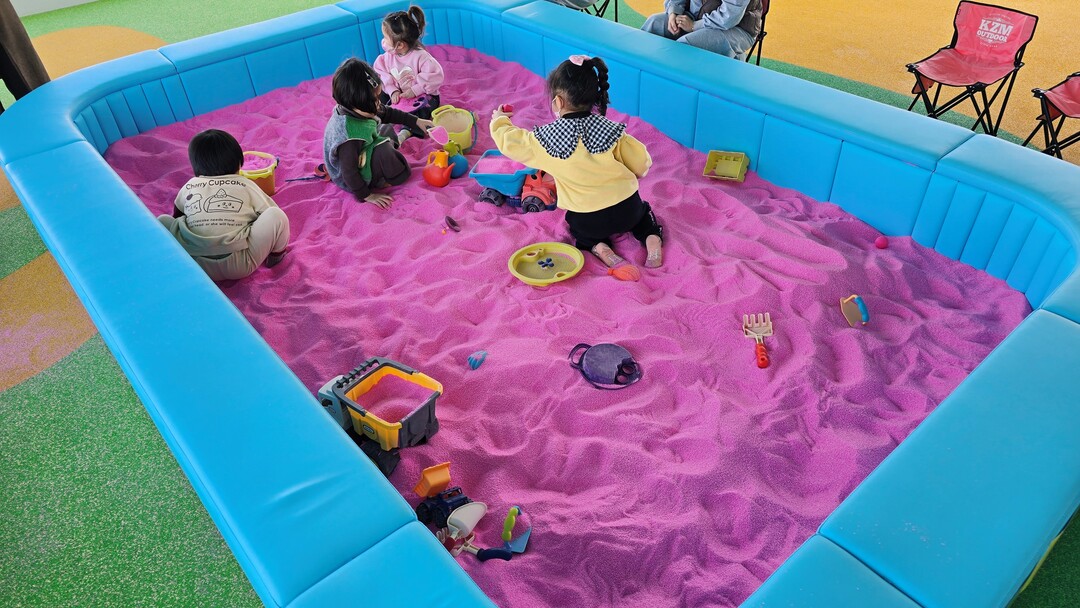 아이봄 키즈카페는 영유아 연령대에 맞춘 놀이 공간과 안전한 실내 환경을 갖춰 아이들이 무료로 안심하고 이용할 수 있도록 조성됐다. 특히 야외 테라스에 설치된 핑크 모래 놀이터는 아이들 사이에서 높은 인기를 끌고 있다.
