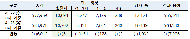 ◆국내 신고 및 검사 현황 (4.23일 0시 기준, 1.3일 이후 누계)