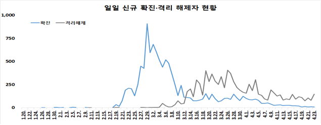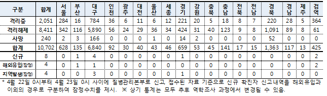 질병관리본부 중앙방역대책본부(본부장 정은경)는 23일 0시 현재, 총 누적 확진자수는 1만702명(해외유입 1,021명·내국인 91.7%)이며, 이중 8,411명(78.6%)이 격리해제 됐다고 밝혔다.