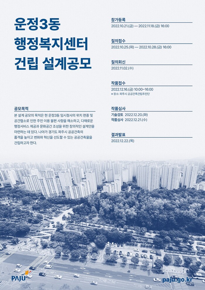 [로컬세계 = 이영원 기자]경기 파주시(시장 김경일)는 21일 운정3동 행정복지센터 건축설계 공모를 실시한다.