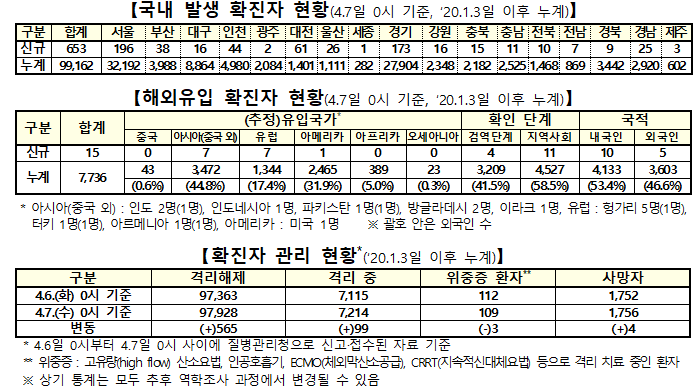 질병관리청 중앙방역대책본부(본부장:정은경 청장)는 7일 0시 기준으로, 국내발생 신규 확진자는 653명이 확인됐고, 해외유입은 15명이 확인돼 총 누적 확진자수는 10만6898명(해외유입 7736명)이라고 밝혔다.