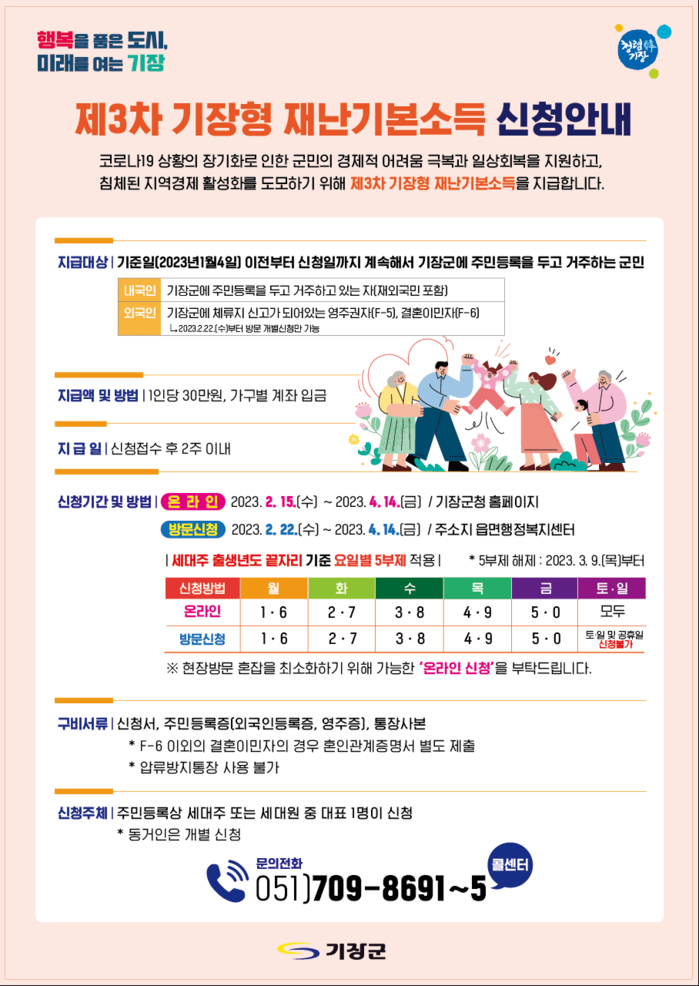 신청접수는 2월 15일부터 기장군청 홈페이지(www.gijang.go.kr) 또는 기장형 재난기본소득 전용사이트(ohhappy.gijang.go.kr)를 통해 온라인 신청 가능하며, 방문 신청은 2월 22일(수)부터 주소지 읍면행정복지센터를 통해 신청할 수 있다.